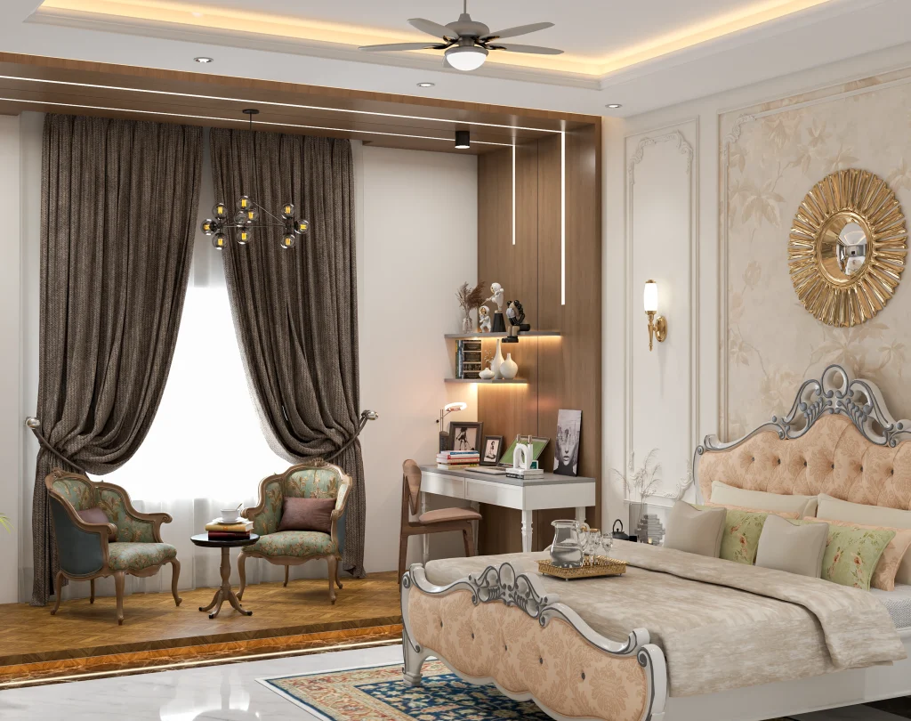 Classic moldings, carved bed frames, and decorative mirrors can be paired with sleek wardrobes and minimalist bedside tables. This fusion approach ensures that the bedroom feels elegant without appearing outdated.